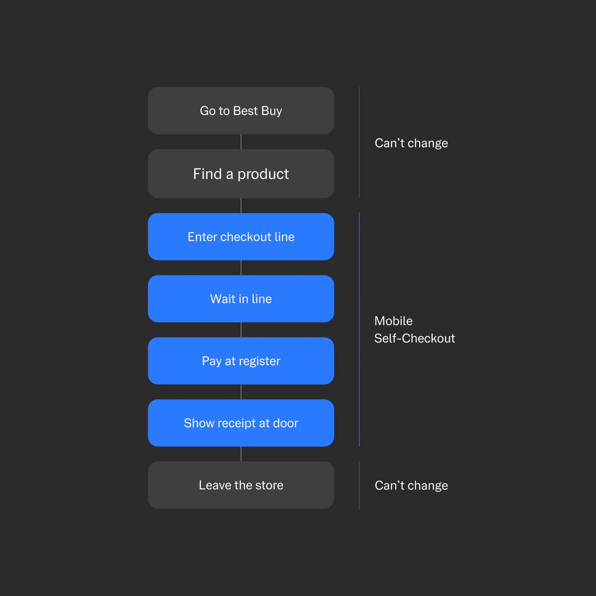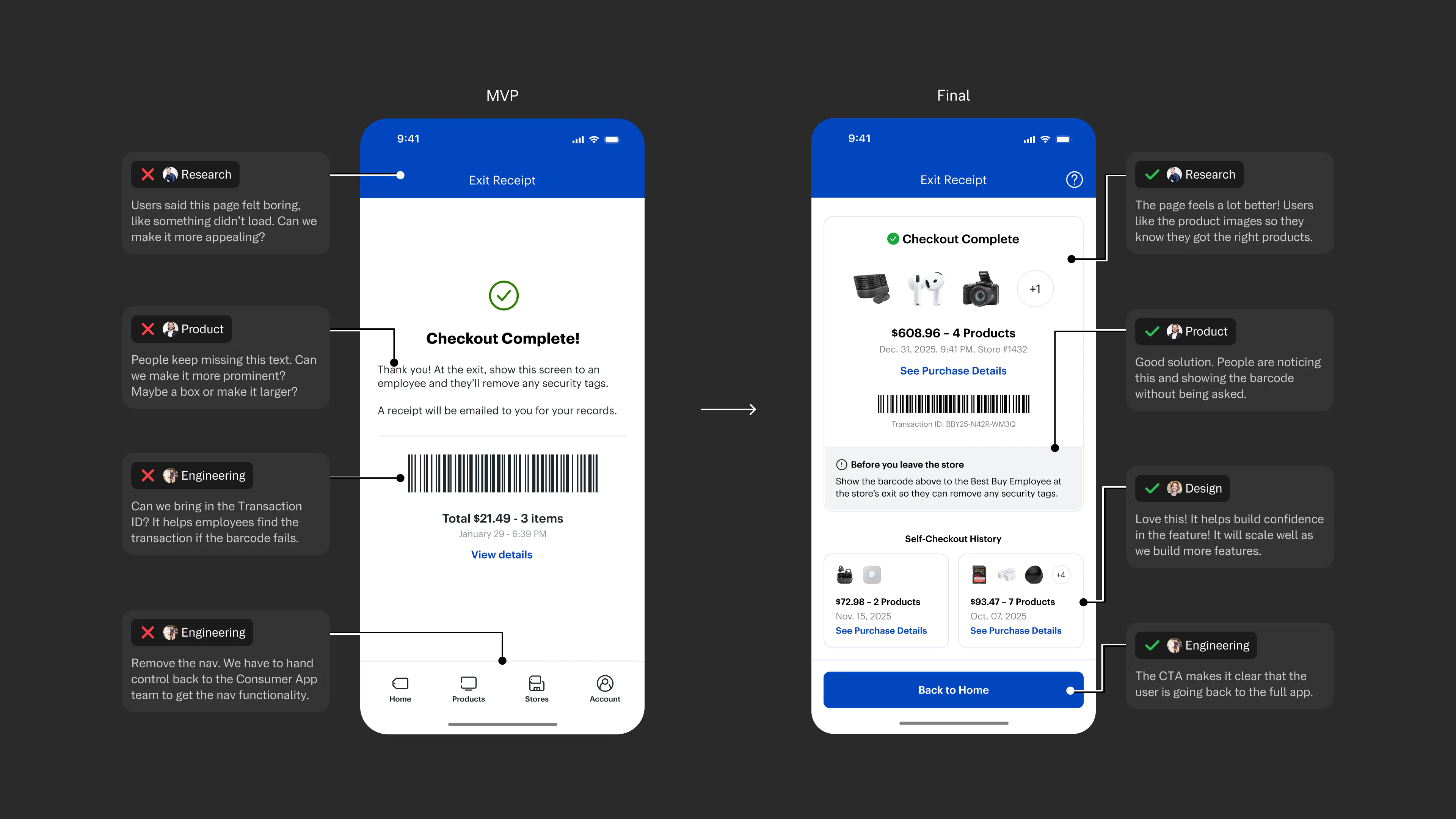 We built a new “Mobile Self-Checkout” feature directly inside the Best Buy app. Customers could scan products, pay instantly, and walk out with a digital receipt: no register, no waiting, no contact.